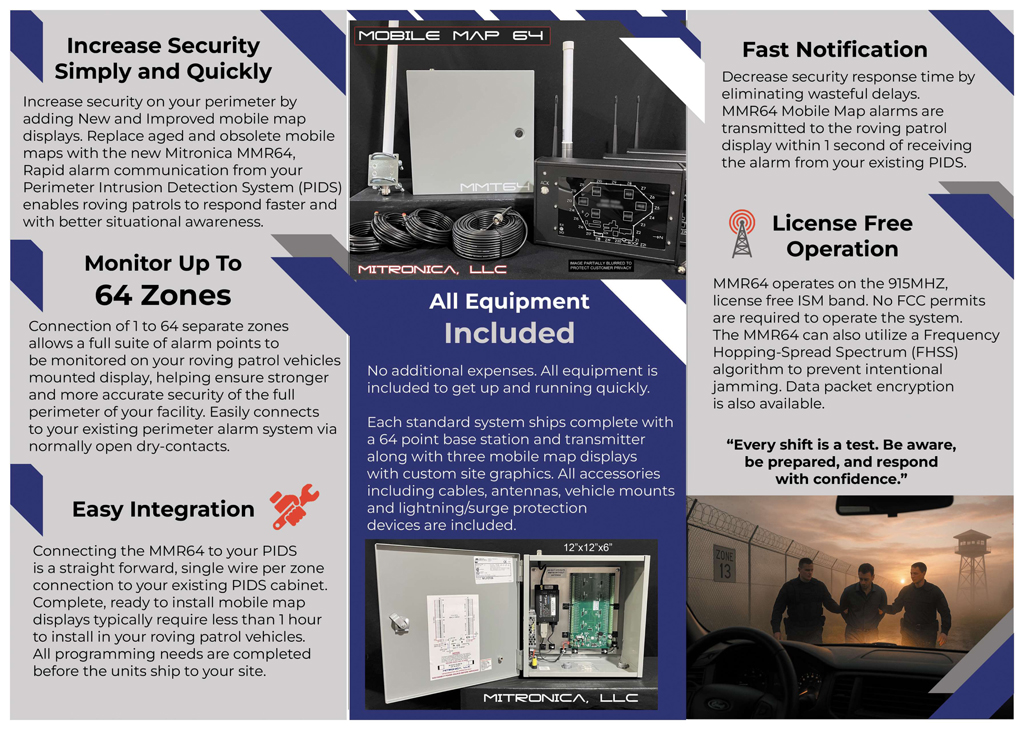 Mitronica’s MMR64 PIDS Mobile Map Display provides immediate perimeter alarm annunciation and location mapping for perimeter intrusion detection systems (PIDS), improving response time for roving security patrols. The platform operates FCC license-free with low latency and does not require cellular service, enabling dependable real-time communications without recurring service fees or licensing overhead. Designed for prisons, correctional and holding facilities, and industrial environments requiring high-security perimeter monitoring.
